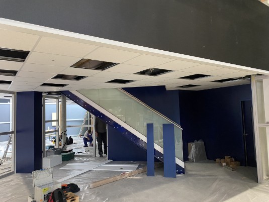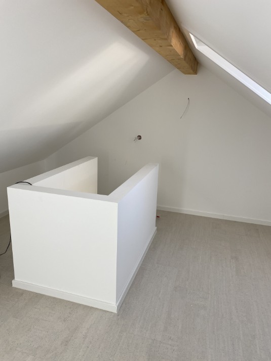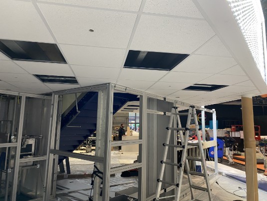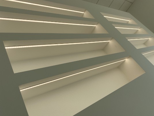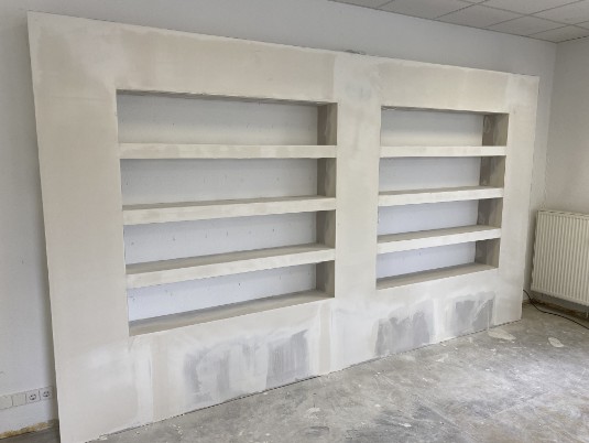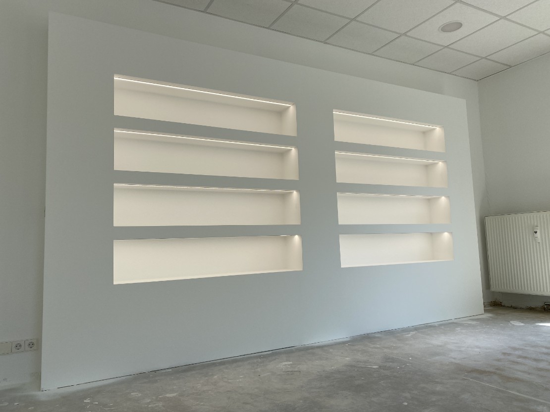 Verkaufsregal als Trockenbausonderlösung mit Beleuchtung und Malerarbeiten im ganzen Studio